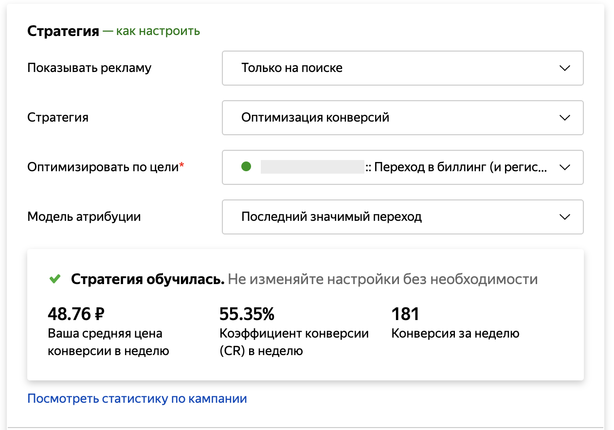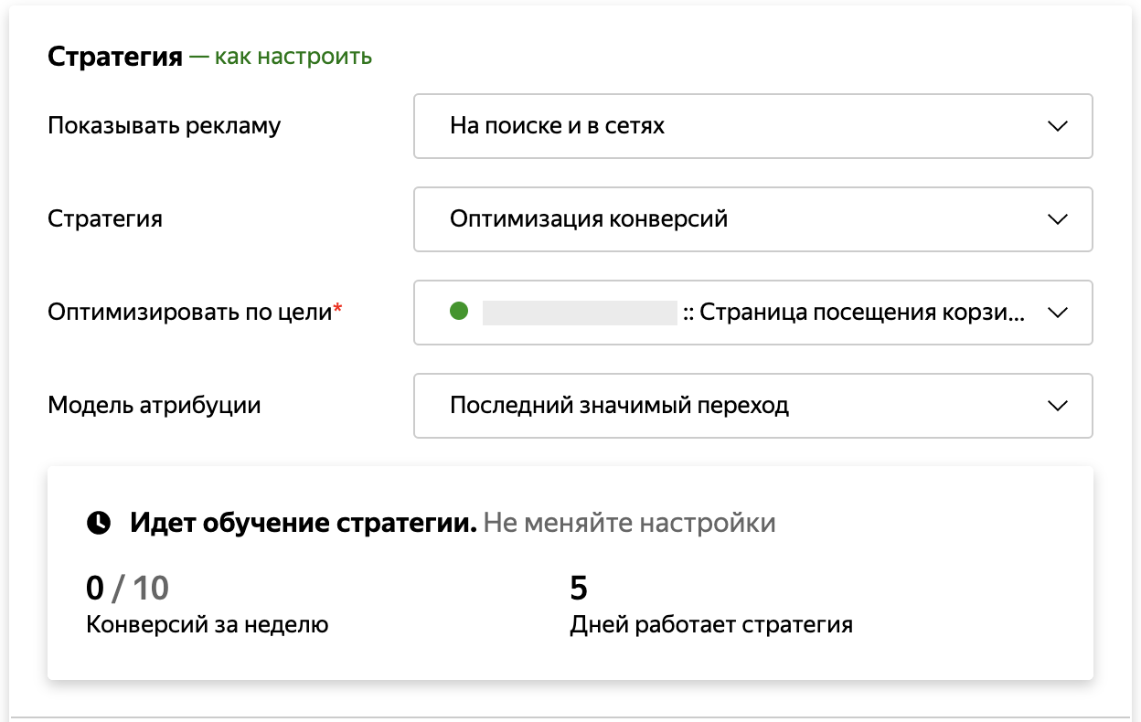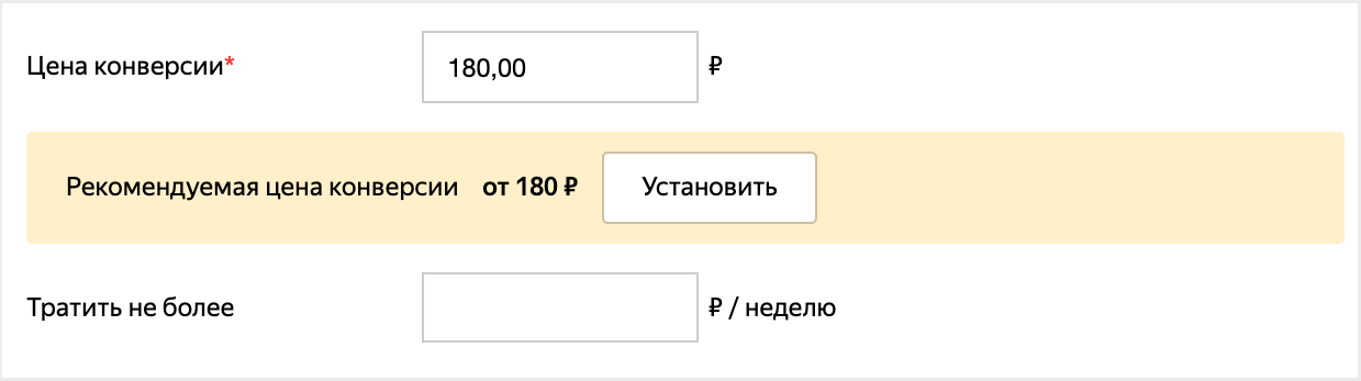 В кампаниях, где нужные цели уже достигались, Директ рассчитает среднюю цену конверсии за последнюю неделю. Рекомендованная цена отображается в настройках стратегии: