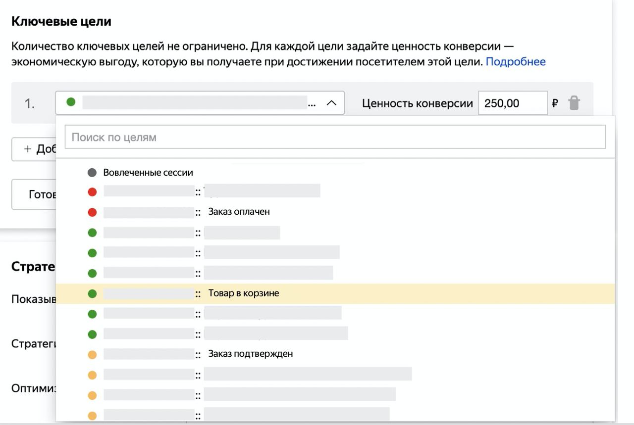 С помощью подсветки Яндекс визуально отображает, какие цели приносят больше конверсий. Зелеными подсвечиваются цели, приносящие более 20 конверсий в неделю, жёлтым — от 10 до 20, а красным — менее 10. Серыми остаются цели, для которых нет данных.