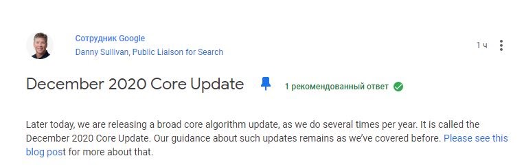 В справке Search Console сотрудник Google Дэнни Салливан поделился сообщением о грядущем декабрьском обновлении ядра: