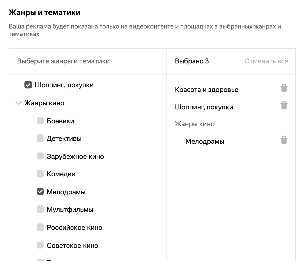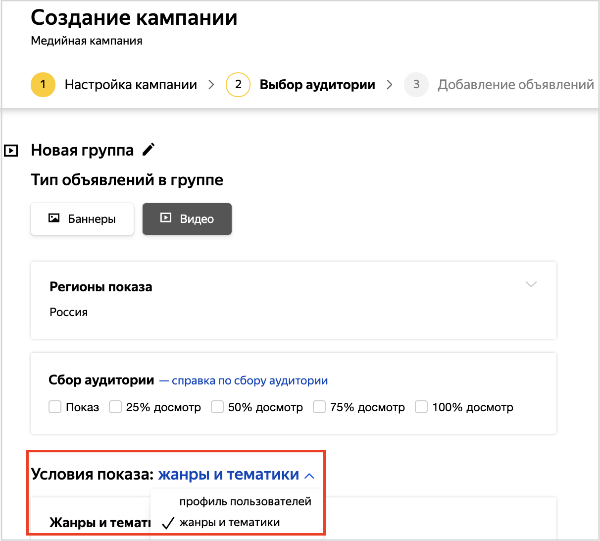 Настроить новый таргет можно во время создания компании. На шаге выбора условий показа необходимо выбрать «Жанры и тематики». Обратите внимание, что вместе с «Профилем пользователя» этот таргет объединить не получится.