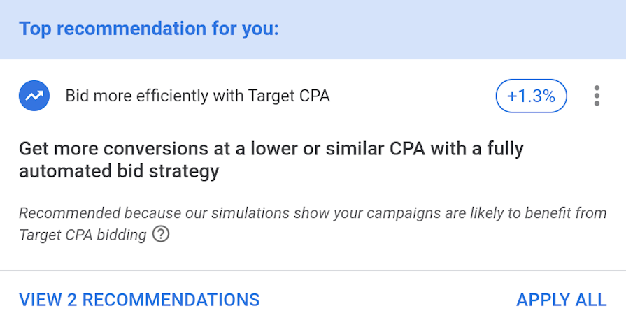 Оценка оптимизации — это система рекомендаций Google Ads, основанная на целях вашей рекламной кампании. Эти цели ориентируются на конверсии, их ценность, процент полученных показов или клики. В зависимости от выбранной стратегии, рекомендации адаптируются под достижение этой цели.