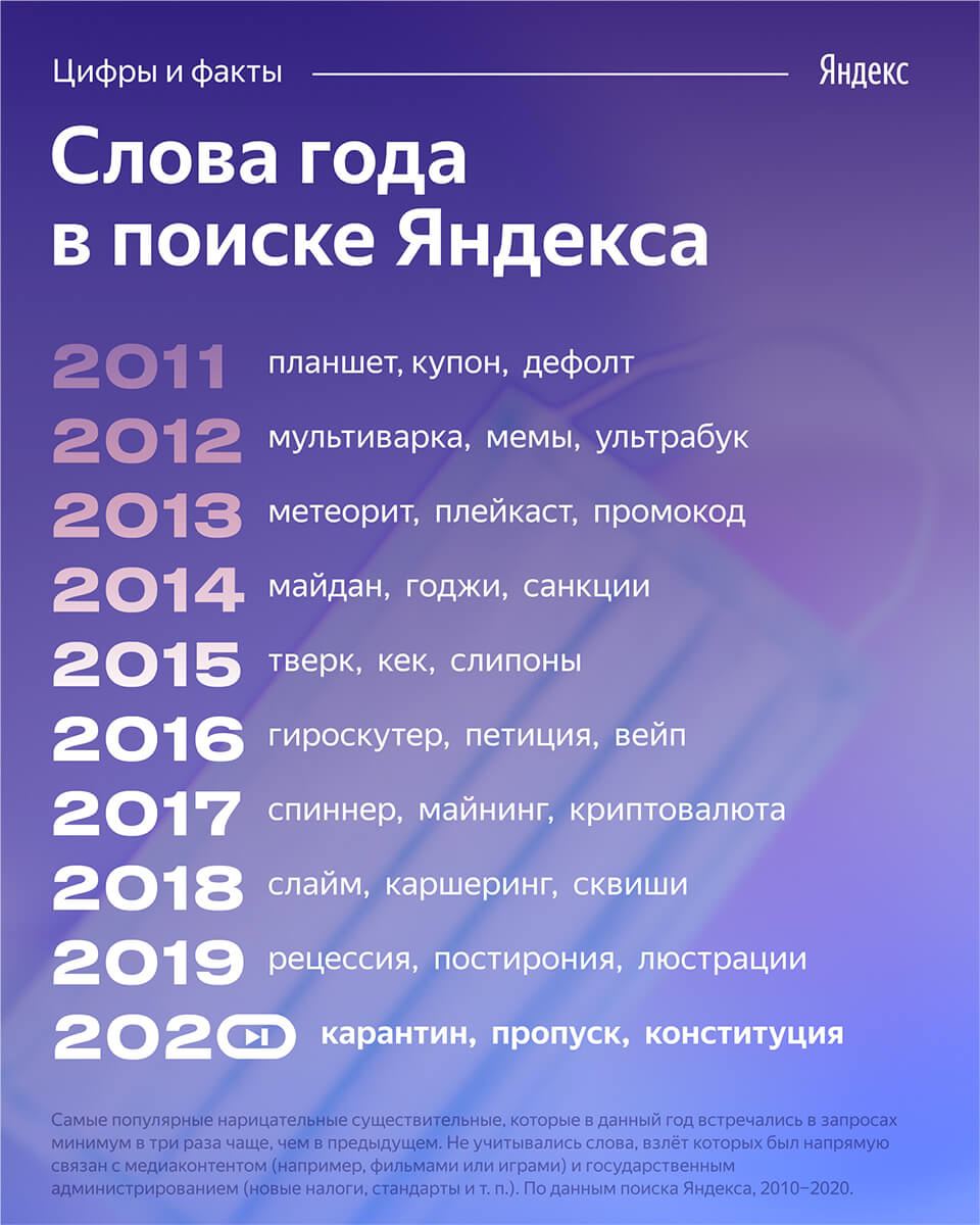 Яндекс опубликовал подборку Слов года за последние десять лет. По аналогии со словарной практикой, словом года называется то имя нарицательное, чье употребление резко возросло в конкретный период времени. Не стоит путать эту статистику с топом запросов в Яндексе, как это уже успели окрестить некоторые источники.
