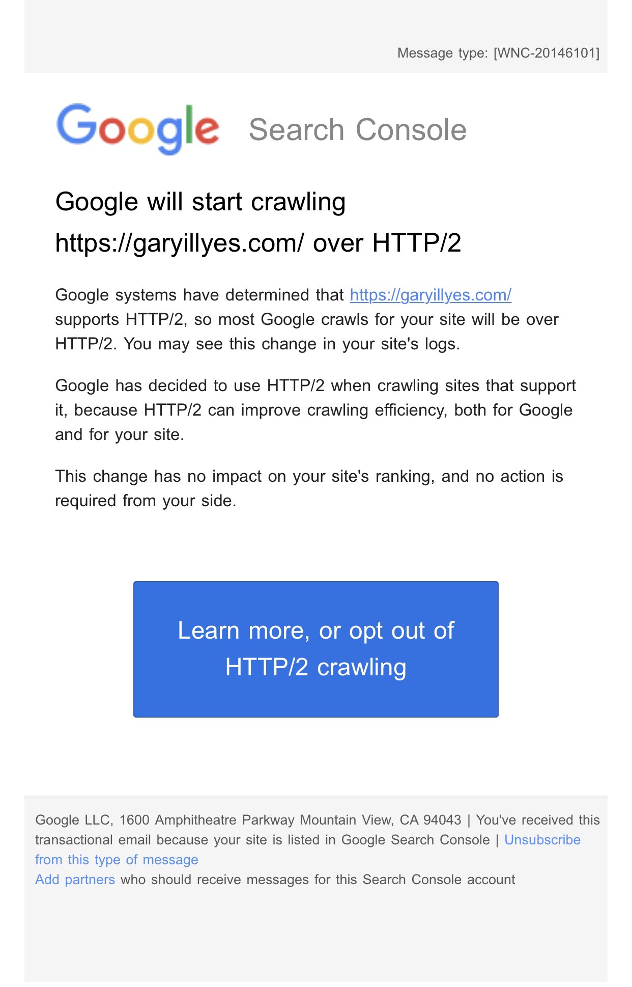 Google начал сканировать сайты по новому протоколу HTTP/2 еще в ноябре прошлого года. Однако, это коснулось далеко не всех сайтов. Накануне сотрудник Google Гэри Илш написал в своем Твиттере, что отправил сообщение для всех оставшихся ресурсов, которые поддерживают HTTP/2.