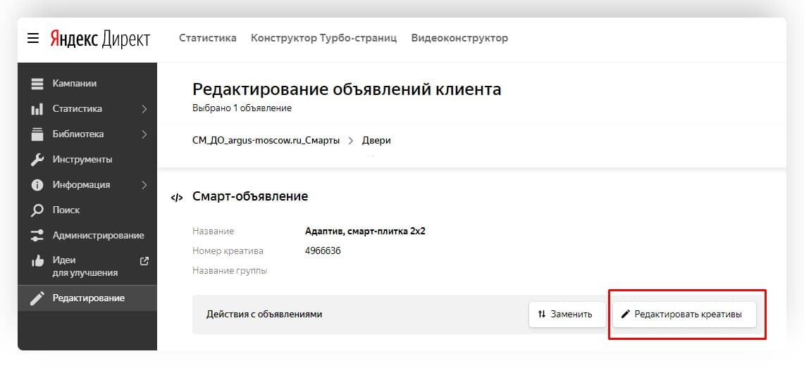 Разработчики Яндекса рассказали о новых функциях и обновлениях в интерфейсе Директа. Главное нововведение — кнопка «Редактировать креативы» в кампаниях со смарт-баннерами. С ее помощью можно редактировать целые группы креативов с общими настройками.