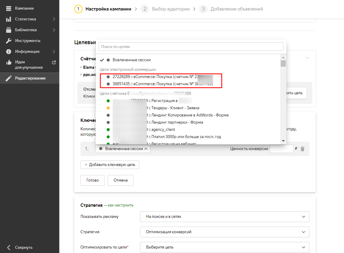 Чтобы цель правильно работала в Директе, в Метрике должна быть подключена электронная коммерция и обновлен код счетчика на страницах сайта. В Директе новая цель доступна в настройках кампании.