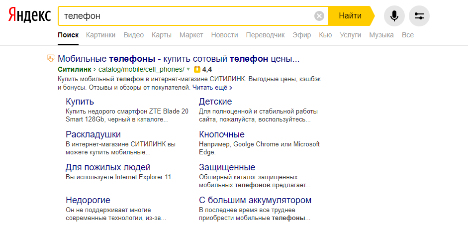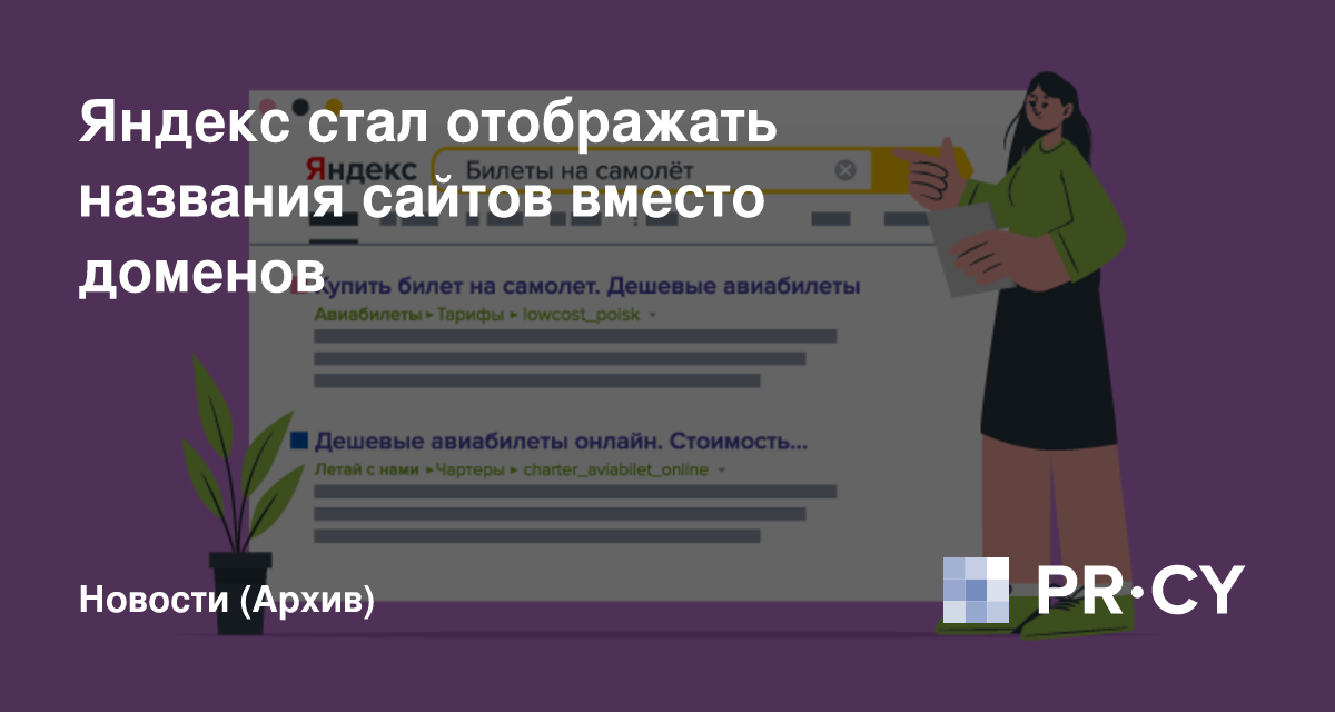 Как заметили многие оптимизаторы, для некоторых сайтов в выдаче Яндекса стало отображаться его русскоязычное название вместо домена. Вот как это выглядит: