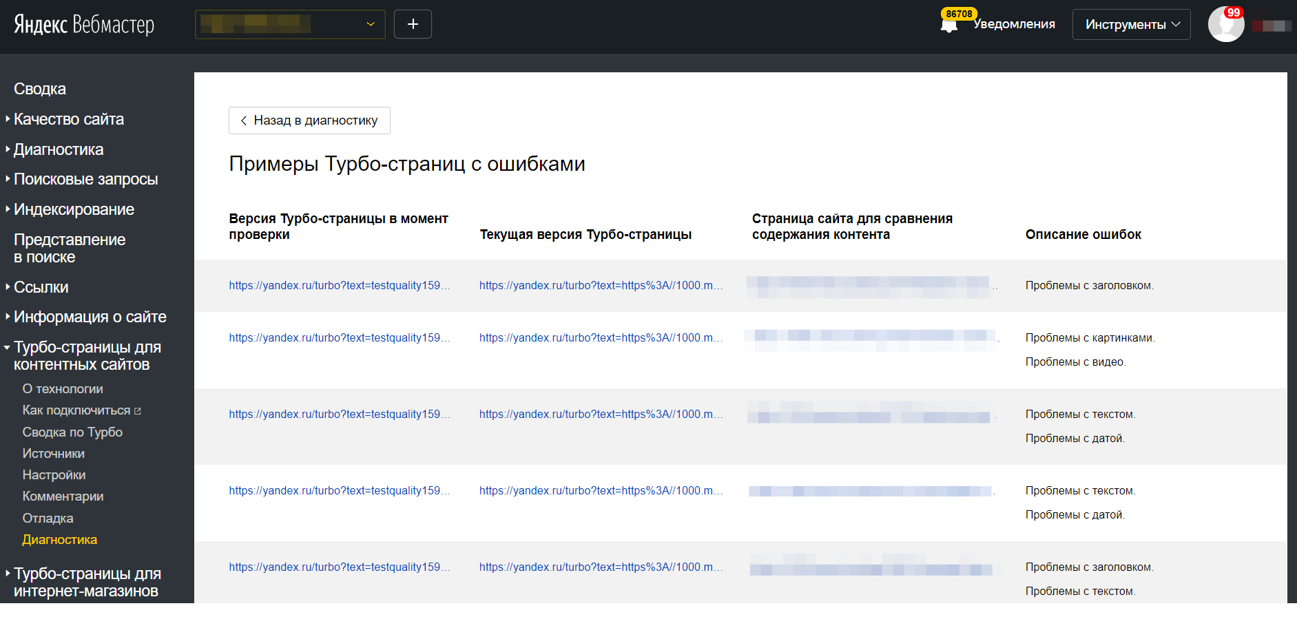 Обновленная диагностика Турбо-страниц теперь объясняет, в чем причина блокировки, подробно описывает детали ошибки и пути их исправления, а также показывает примеры.