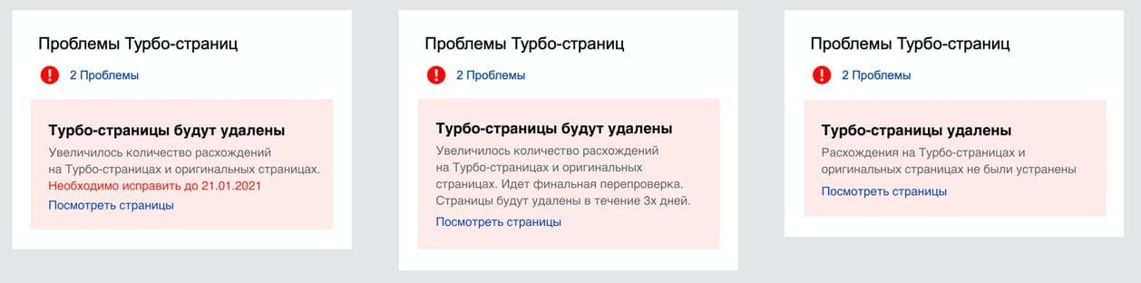 Красный присваивается Турбо-страницам с критическими ошибками, которые необходимо устранить в течение 21 дня. В противном случае эти страницы будут удалены. Красный цвет также остается, пока страница находится на проверке или если она удалена.