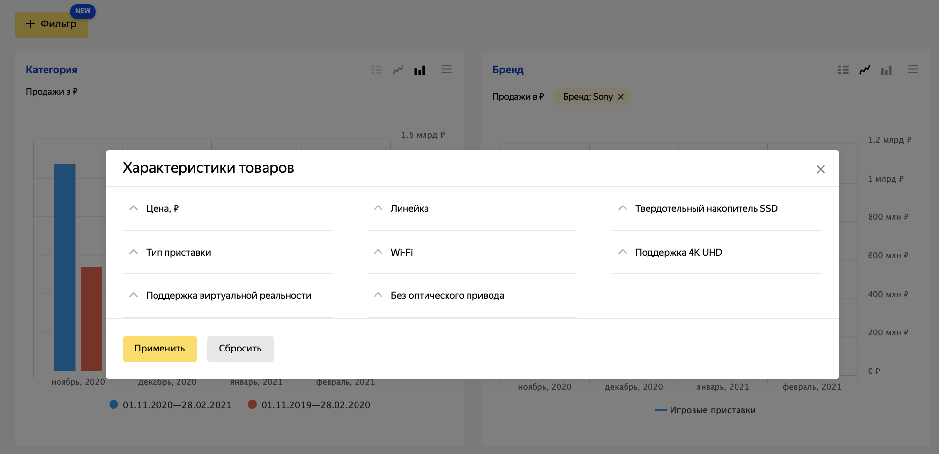 Для каждого отдельного отчета Яндекс.Маркет добавил фильтр по характеристикам. Под инфопанелью появилась кнопка «Фильтр», с помощью которой можно выбрать необходимые характеристики. Фильтр можно настроить также для всех отчетов разом. Он доступен для тех же групп пользователей, что и новый отчет.