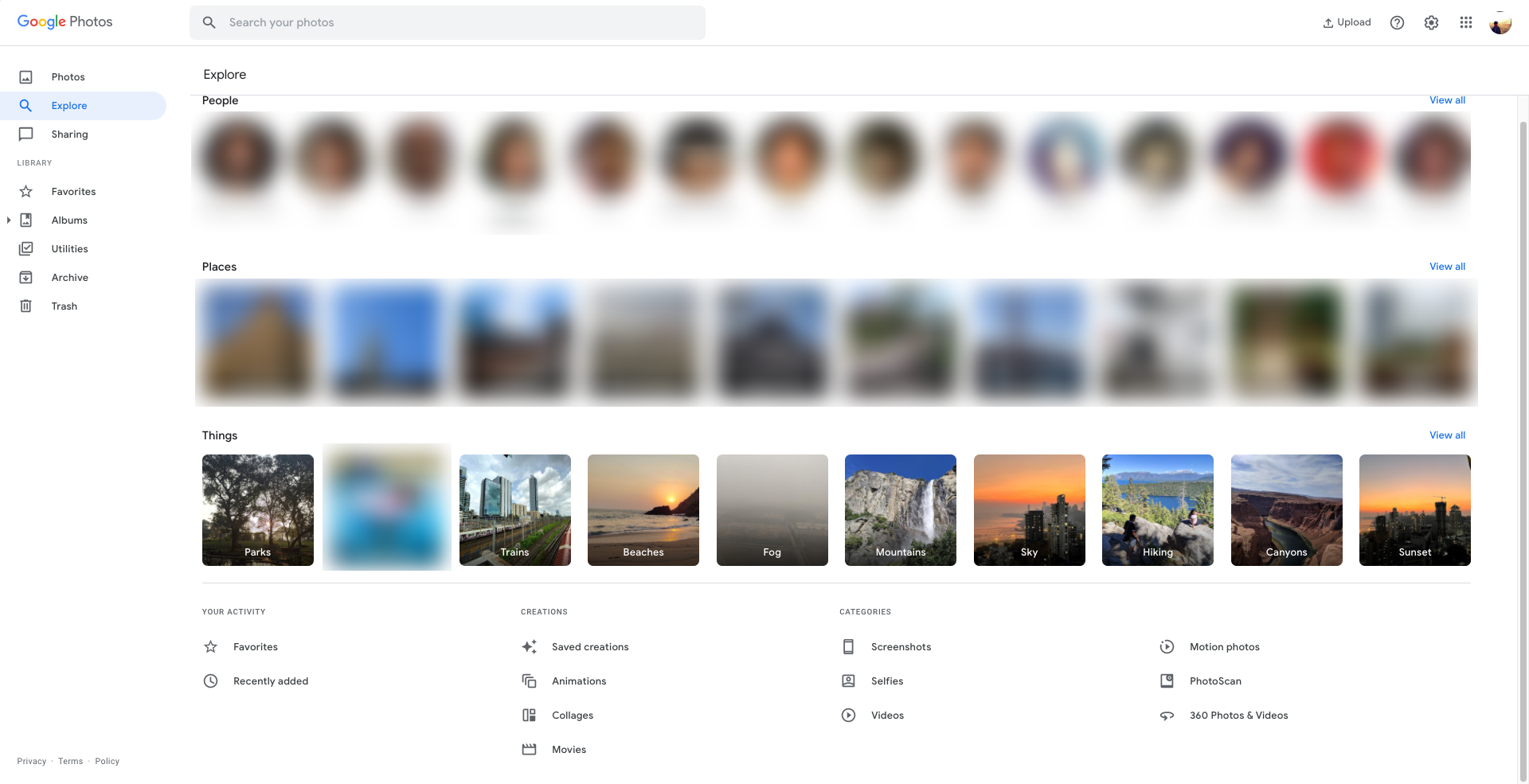 В десктопном интерфейсе Google Фото появилось две новые вкладки, знакомые пользователям мобильных приложений для Android и iOS. Это вкладки Explore и Favorites. Explore является аналогом Поиска в мобильном приложении и предлагает несколько подборок по категориям: люди, места. вещи, скриншоты и видео.