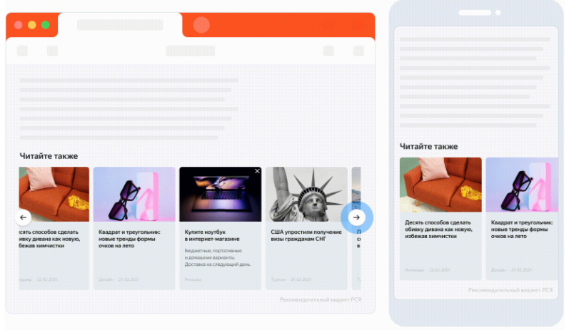 Новый формат доступен и для мобильных устройств, и для десктопа. Для настройки слайдера необходимо выбрать соответствующий формат в настройках рекомендательного виджета.