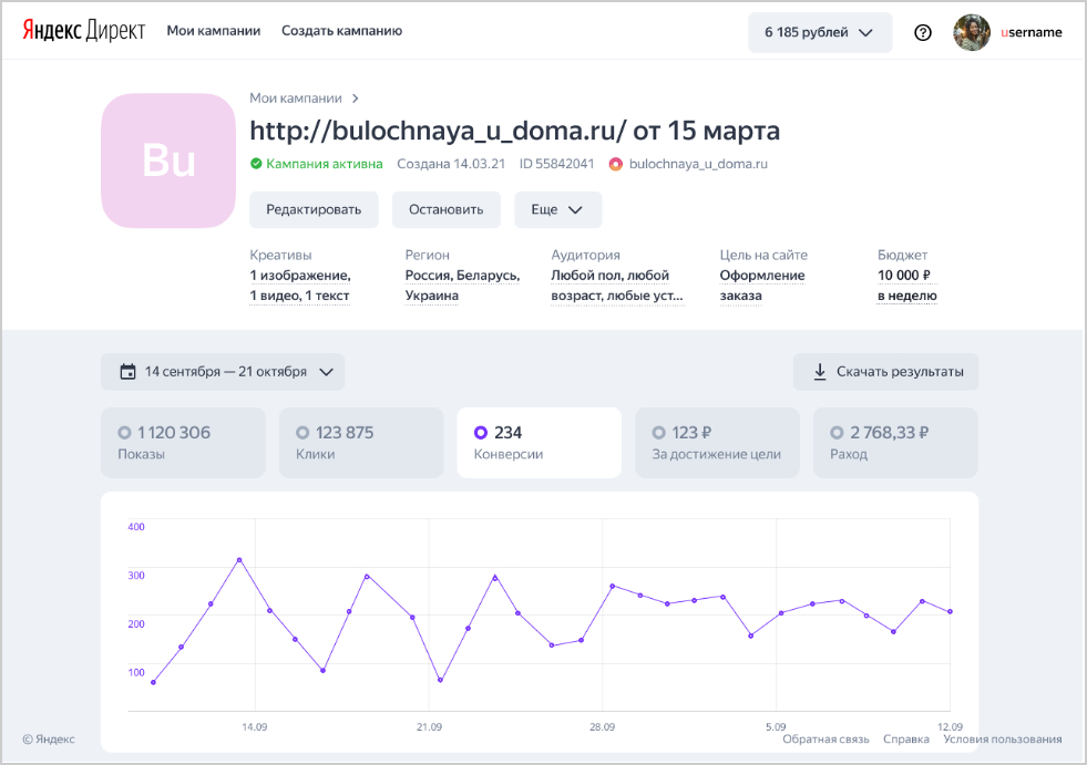 Статистика по кампании доступна на ее странице. В ней вы увидите вашу аудиторию, регион, ключевые цели кампании, бюджет, тип устройств, с которых заходили пользователи, тематические слова и многое другое.