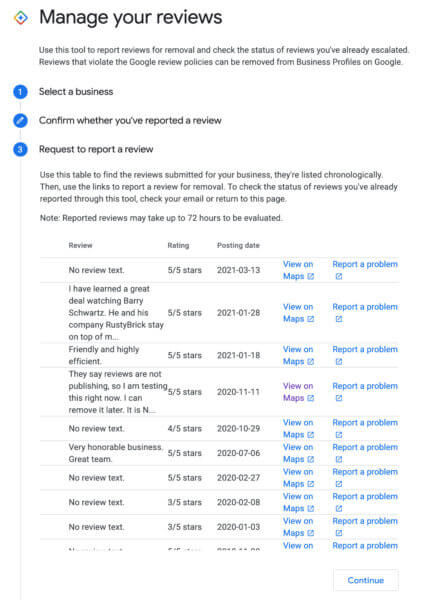 При выборе жалобы GMB откроет окно со всеми недавними отзывами и возможностью просмотреть их на Картах или сообщить о нарушении.
