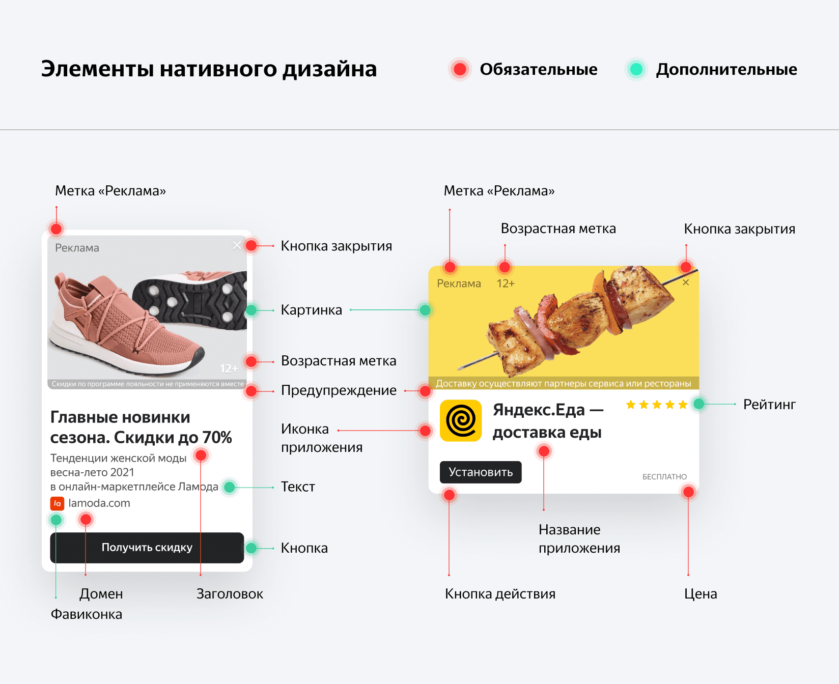 Обратите внимание, для отображения рекламы в РСЯ имеются обязательные элементы дизайна. По правилам РСЯ они всегда должны быть в рекламном блоке. Они могут отличаться в мобильной и десктопной версиях.