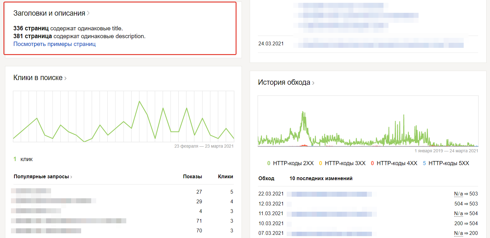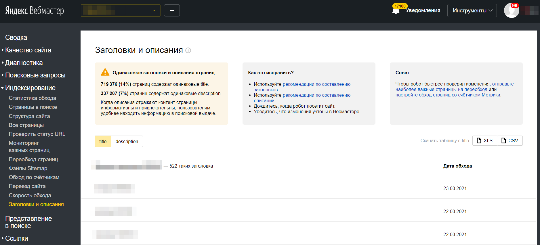 Информацию о дублирующихся тегах title и description теперь можно найти в разделе Индексирование — Заголовки и описания. Здесь отображаются примеры страниц с неуникальными тегами.