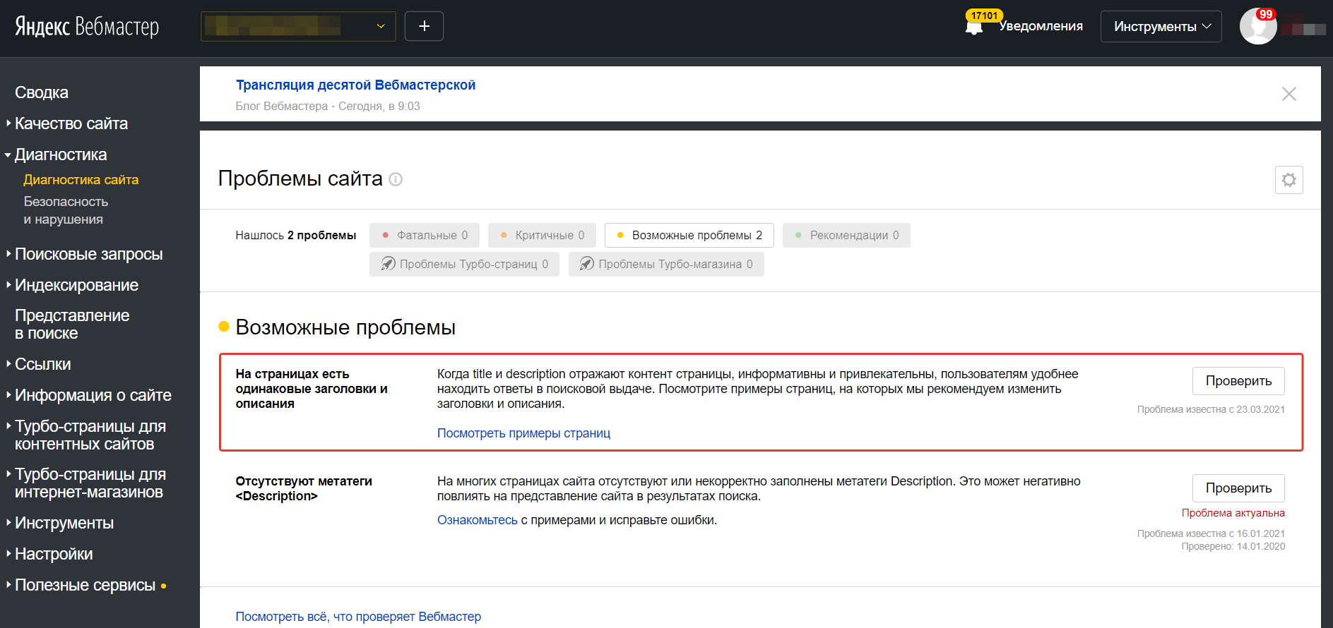 В Диагностике появился новый специальный алерт. Если у вас обнаружится большое количество дублирующихся тегов, вам на почту придет уведомление. Чтобы его активировать, подпишитесь на «Возможные проблемы» и Диагностике.