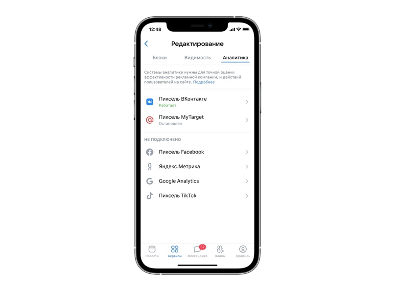 В новой вкладке «Аналитика» в режиме создания и редактирования страницы, помимо обновленного дизайна интерфейса, появилась возможность подключить пиксели из других ресурсов. Кроме пикселя ВКонтакте, который доступен по умолчанию, можно подключить MyTarget, Яндекс.Метрику, Google Analytics, TikTok и Facebook.