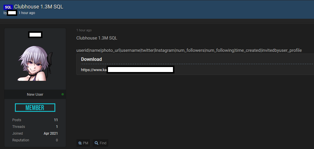 Cybernews сообщает о том, что данные 1,3 млн пользователей Clubhouse утекли на популярный хакерский ресурс (название домена не сообщается).