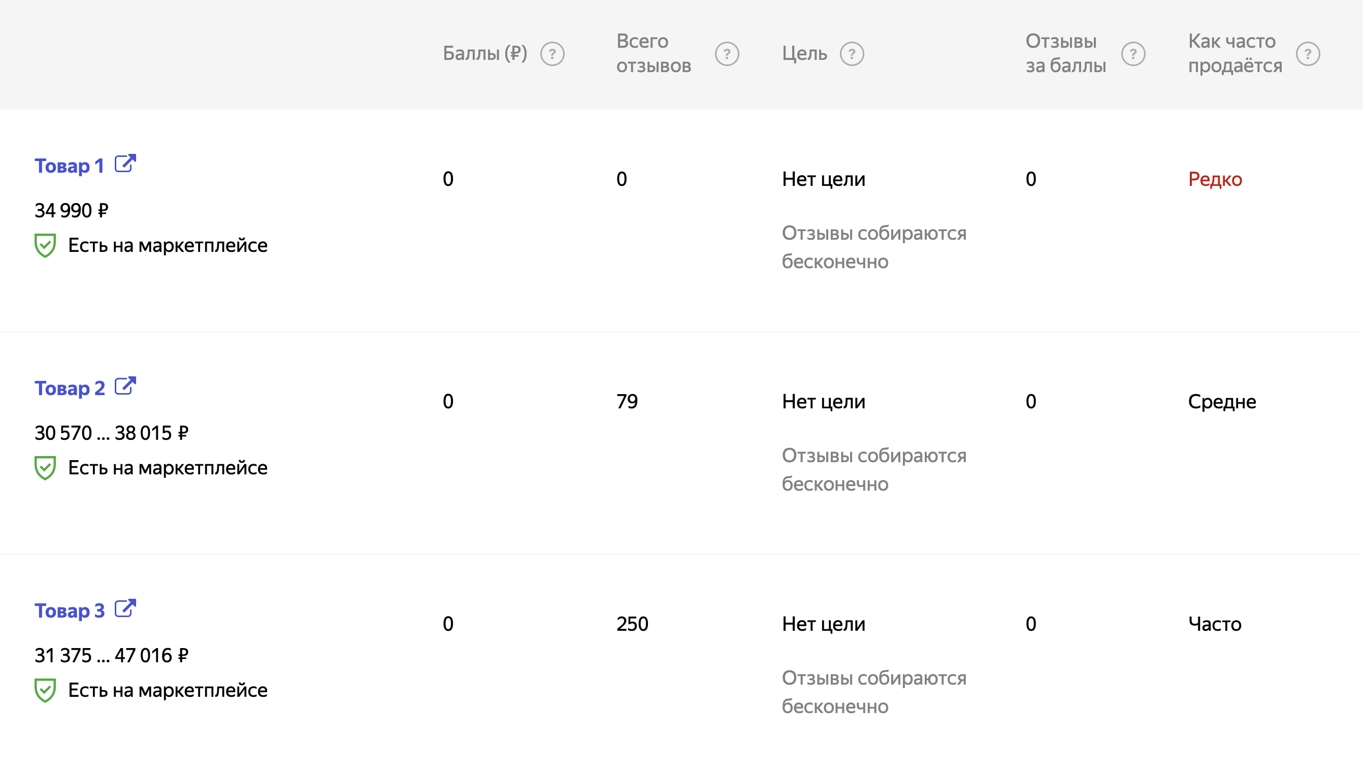 выбрать товары и указать число баллов, начисляемых за отзыв (минимум — 50, где 1 балл=1 рубль);