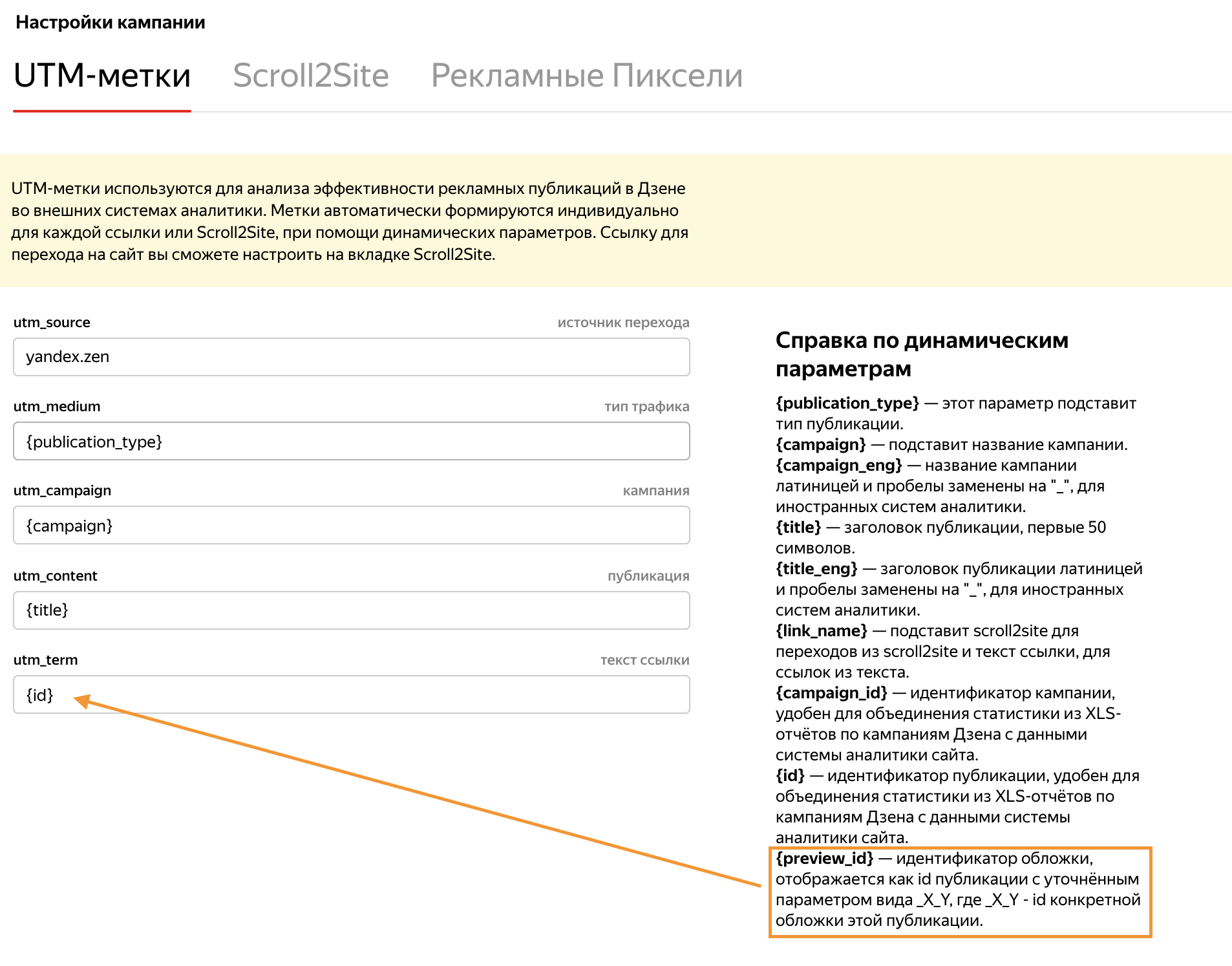 Чтобы использовать новую функцию, необходимо вписать параметр подстановки {preview_id} вместо параметра {id} в поле utm_term в редакторе UTM-меток. В новых кампаниях этот параметр выставляется автоматически, в старых его нужно вписывать вручную.