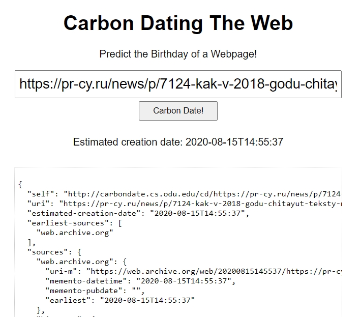 Carbon Dating The Web ищет в коде страницы упоминания о ее создании.Чтобы увидеть результат, нужно только ввести в поле URL страницы. Быстрый способ в один клик, но не очень точный.