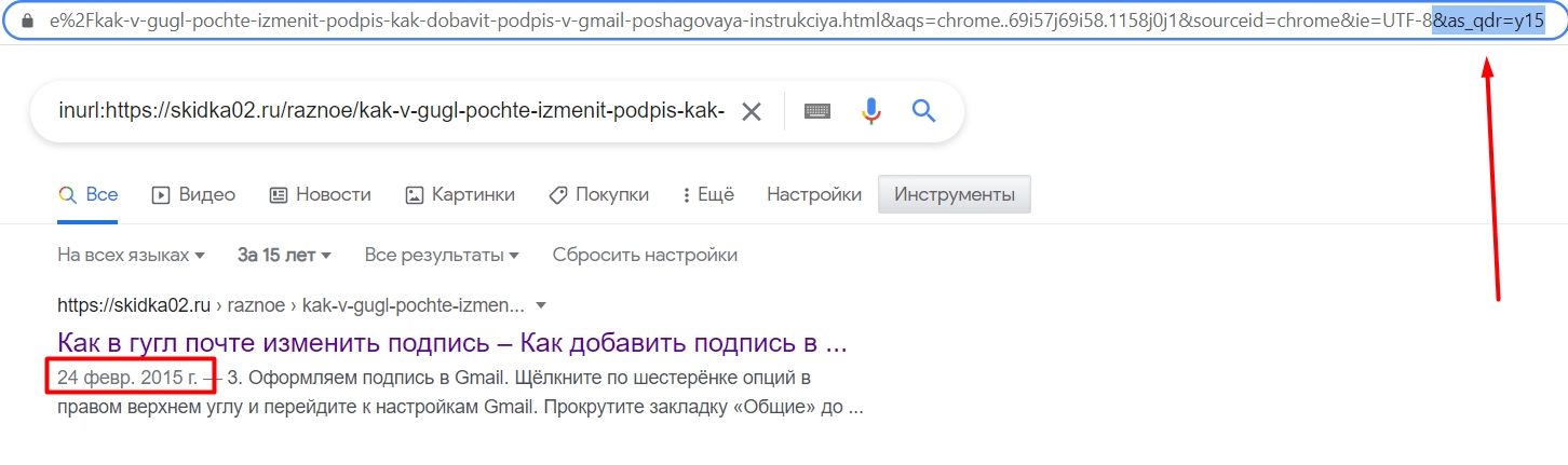 Дата не появилась, нужен последний шаг. В адресную строку (не в поисковую) в самый конец добавьте &as_qdr=y15 и нажмите Enter. Дата появится.