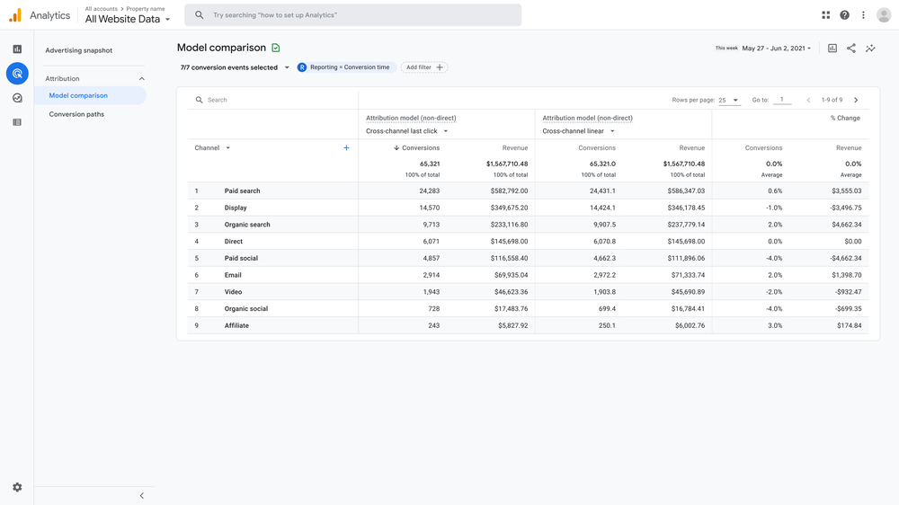 А с помощью отчета Model Comparison можно увидеть различные модели атрибуции и влияние на разные каналы.