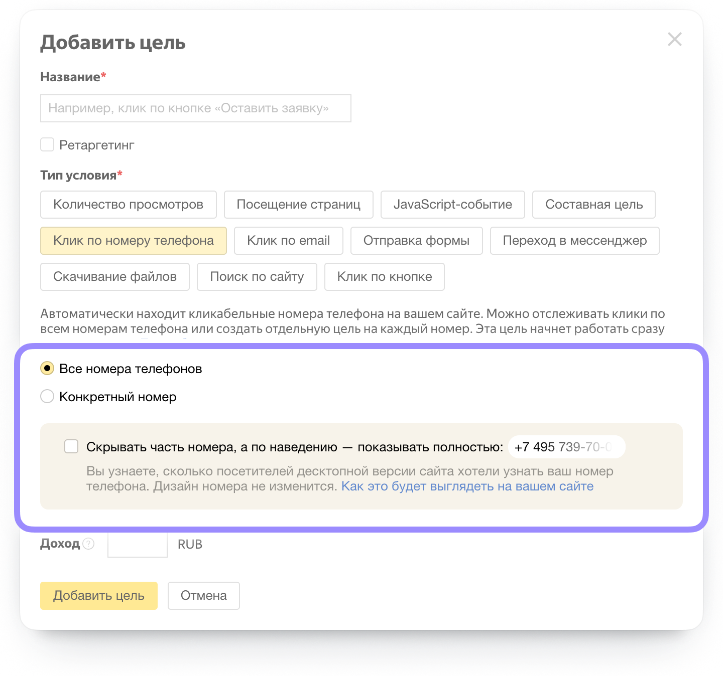 В десктопной версии за целевое действие засчитается наведение курсора на скрытый номер, а в мобильной версии тап по номеру, чтобы позвонить вам.