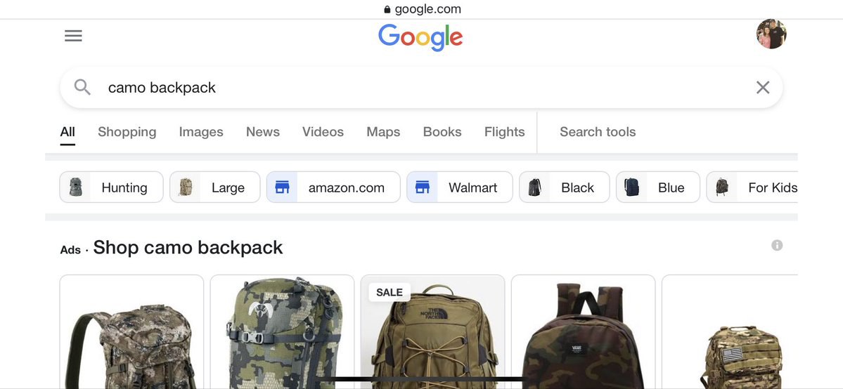Например, при запросе «камуфляжный рюкзак» фильтр предлагает выбрать цвет, размер, а также маркетплейс, где вы его можете приобрести.
