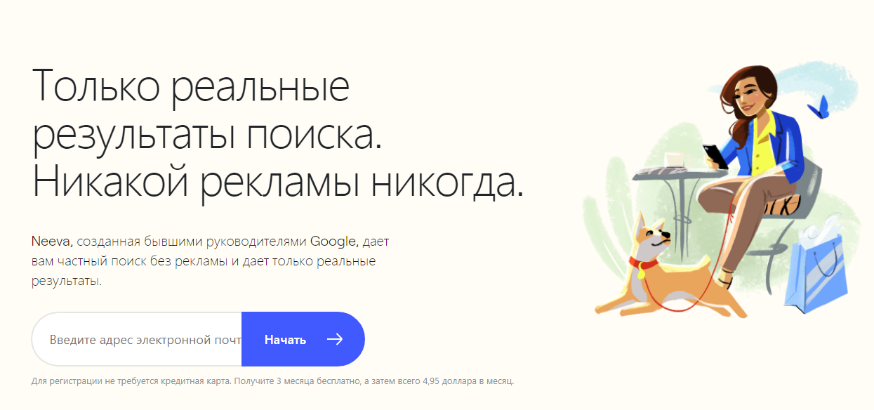 Разработчики поисковой системы решили отказаться от рекламы, чтобы исключить отвлекающие факторы при работе и улучшить защиту конфиденциальности пользователей. Отсутствие рекламы также привело к решение сделать поисковик платным. Первые три месяца Neeva работает бесплатно, а затем — за $ 4,95 в месяц.