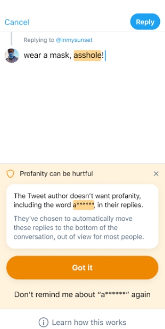 Возможность указать нежелательные фразы в ответах на ваши твиты и публикациях в ленте. Подписчики профиля увидят эти фразы выделенными вместе с предупреждением, что не стоит их использовать.