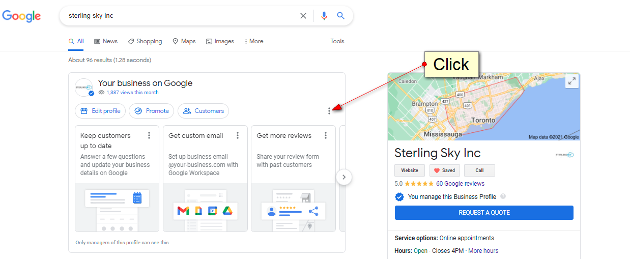 Нажать на иконку из трех точек в правом углу блока Your business on Google.