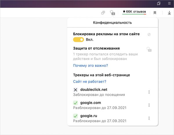 Раньше даже единичное посещение ресурса могло привести к установке «вечного» трекера, теперь время действия и окончания трекера открывается по клику на иконку щита в адресной строке.
