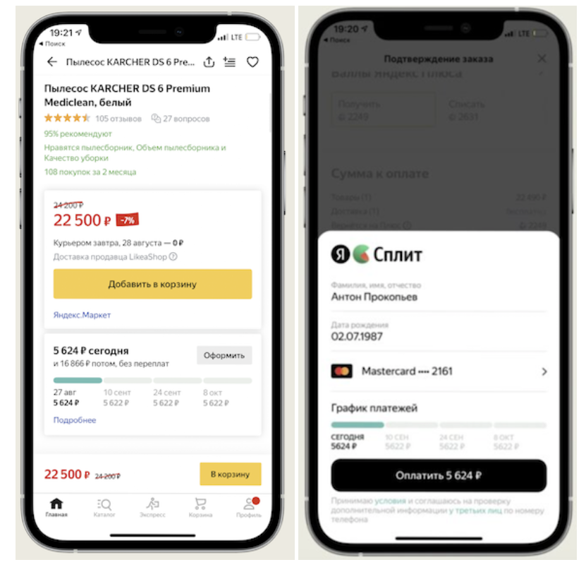 При оформлении заказа с помощью Сплита покупатель оплачивает только 25% стоимости товара, оставшиеся 75% списываются с его карты равными частями каждые две недели. Продавец получает сразу всю сумму целиком.