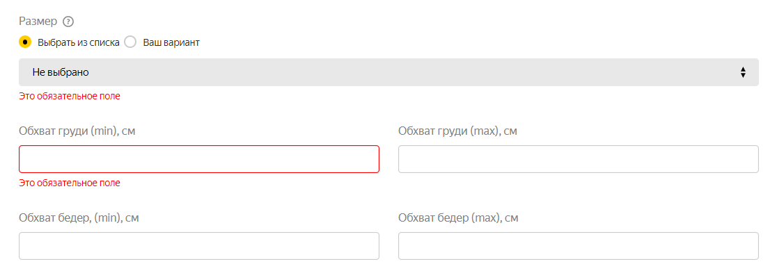 Чтобы создать карточку товаров, необходимо передать маркетплейсу обязательные данные: название, штрих-код, описание и хотя бы одно изображение. Плюс необходимо добавить специфическую информацию для товаров из этой категории: бренд, размер производителя и мерку для этого размера. Избежать ошибок в заполнении в дальнейшем помогут подсказки при создании.