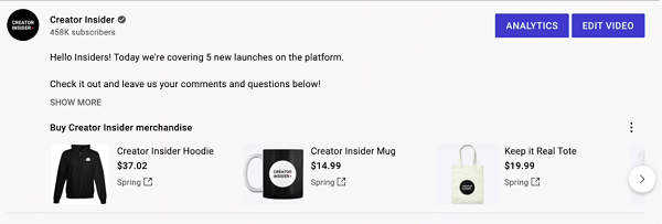 Новый раздел доступен прямо под окном проигрывателя. Чтобы добавить товары, канал должен соответствовать требованиям: