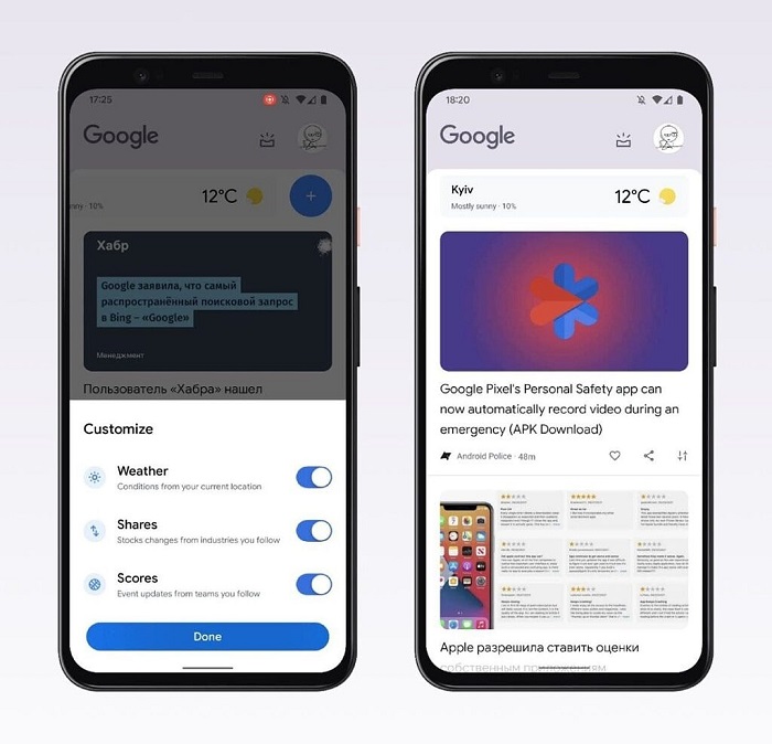 При желании пользователь может настроить эту панель так, чтобы на ней отображалась только одна карточка, но с большим количеством информации. Например, при просмотре карточки погоды, помимо температуры будет отображаться название города, влажность и тд.