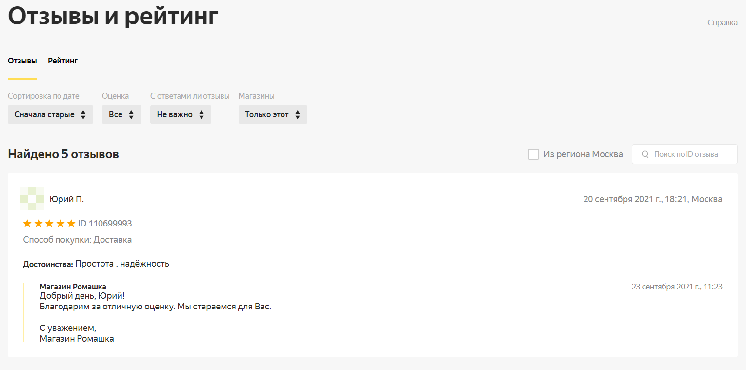 Рейтинг рассчитывается как среднее арифметическое из всех оценок по всем магазинам за последнии три месяца. Его тоже видят все покупатели Маркета. Каждый отзыв проходит проверку на накрутку и спам. Если за этот период у вас меньше пяти оценок, то рейтинг берет оценки за все время.