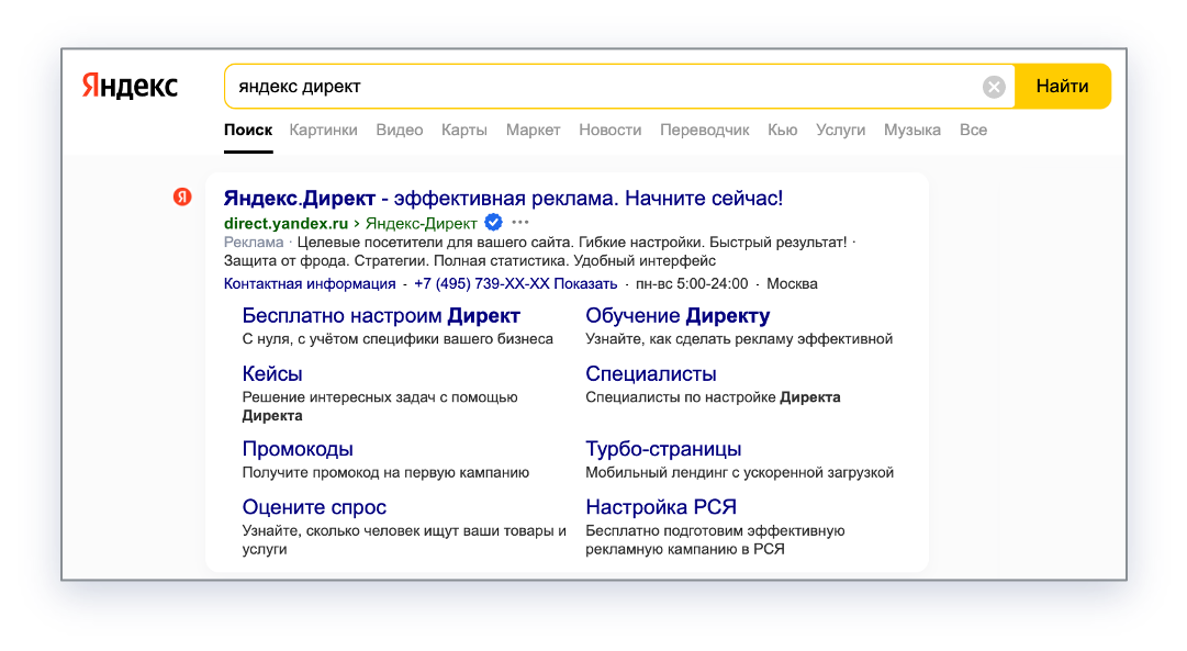 Эксклюзивное размещение — это самый большой вариант показа рекламного объявления в Яндексе. Объявление располагается над результатами поиска, и в зависимости от устройства занимает до восьми быстрых ссылок с описанием.