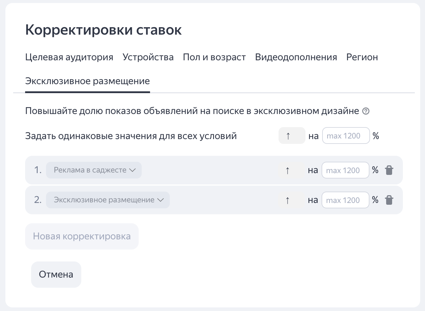 Теперь рекламодатели могут выставлять повышающие корректировки на показ объявлений в одиночном эксклюзивном размещении и в рекламе в поисковых подсказках.