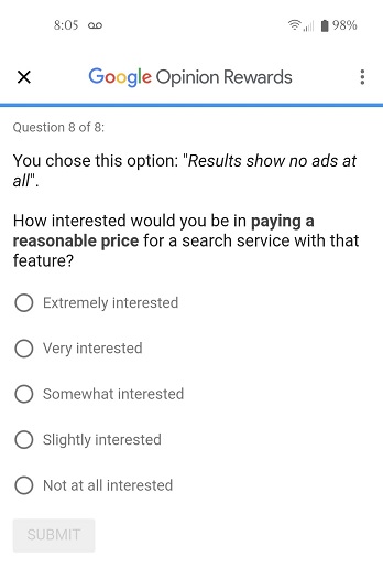 Оптимизатор Эли Шварц сообщил об опросе, который проводит поисковик. Google опрашивает пользователей, готовы ли они платить «разумную цену» за отсутствие рекламы, и насколько им это интересно. Видимо, поисковик задумывается о внедрении такой функции.