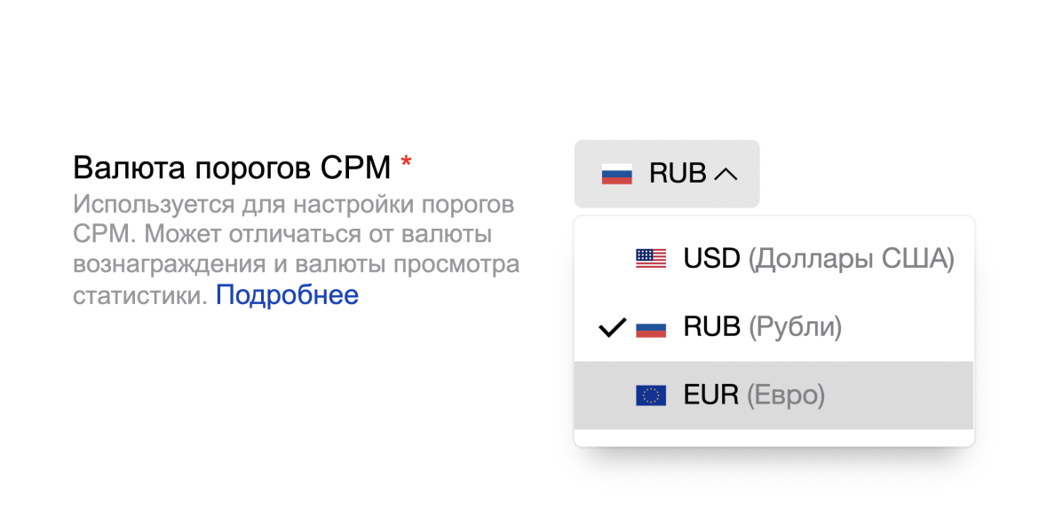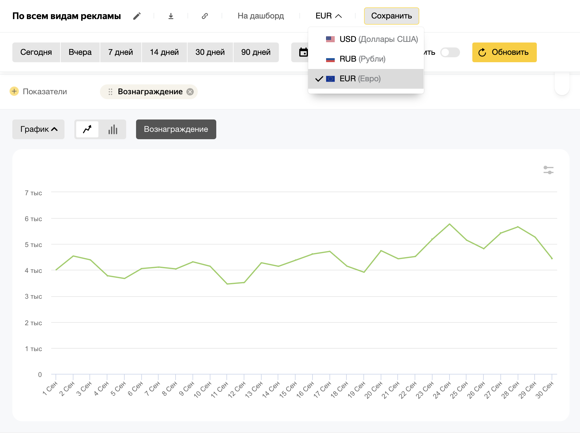Яндекс добавил в РСЯ возможность настроить валюту в интерфейсе, отображаемую для вознаграждений и статистики. Собственную настройку можно использовать во всех RTB-блоках на сайте и в мобильных приложениях.