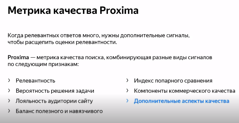 Метрика называется Proxima, она включает в себя несколько факторов, влияющих на качество поиска. Помимо привычных коммерческих аспектов и лояльности клиентов, в нее входят показатели экспертности и доверия.