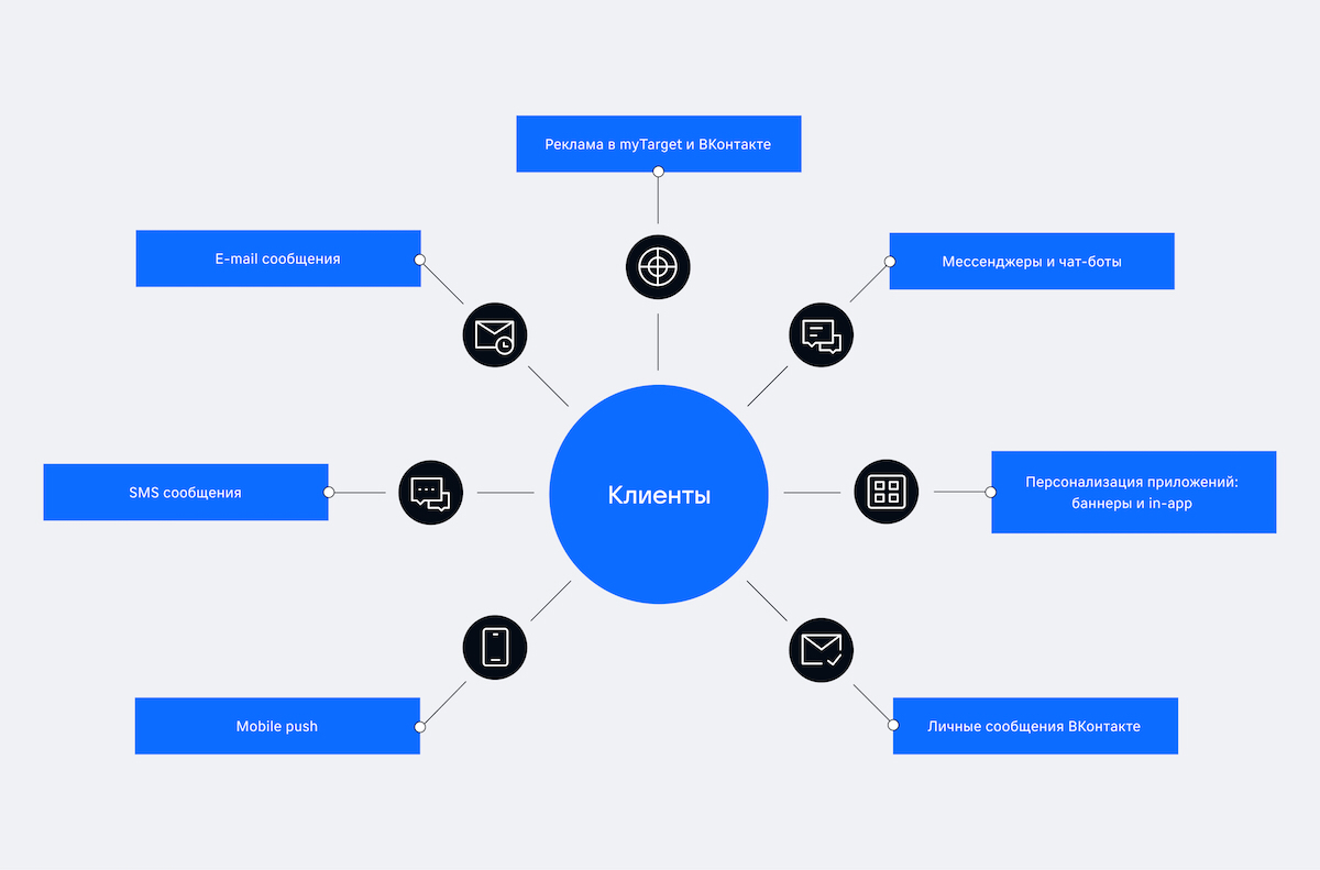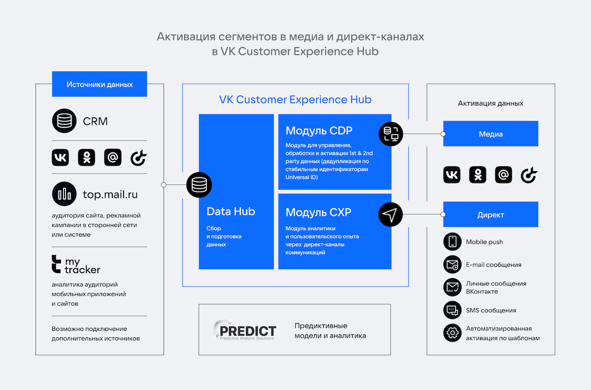 Платформа позволяет управлять всеми рассылками и запускать таргет через ВК и myTarget. VK Customer Experience Hub также интегрирован с Predict и VK Чекбэк.