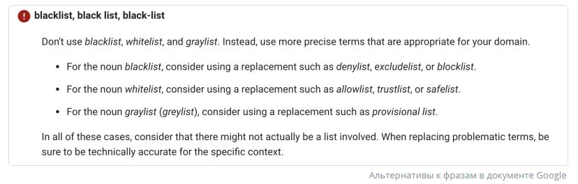 Google автоматически блокирует добавление этих фраз в документы поиска. Об этом сообщили западные коллеги, обнаружившие список в англоязычном документе в Руководстве по стилю документации для разработчиков Google. В нем также содержатся альтернативы, которые можно использовать вместо запрещенных слов.