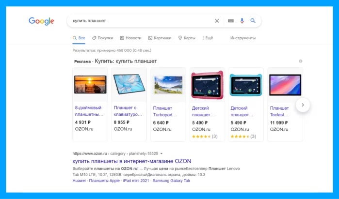 Товары появятся в рекламном блоке на странице результатов поиска, поиске по картинкам, в YouTube, Gmail, сервисе «Покупки» и на сайтах программы Google Search Partner.