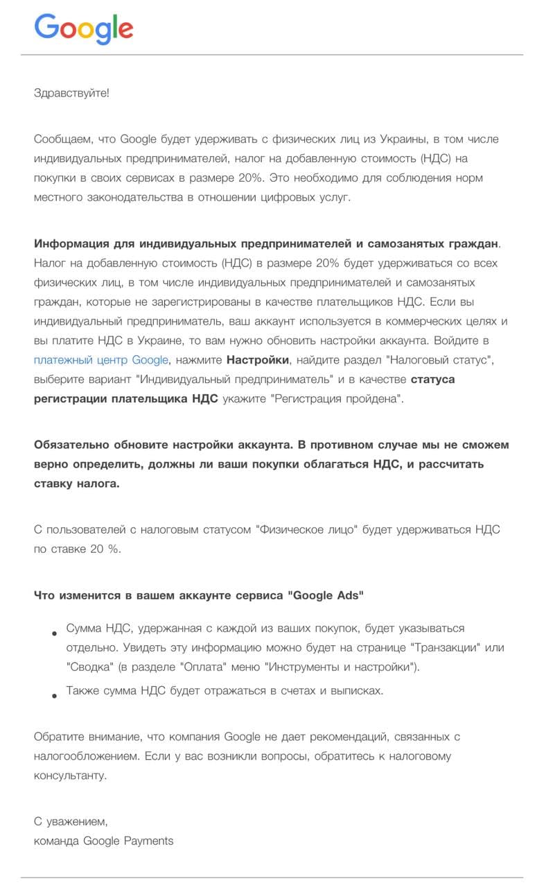 Google обновил условия налогообложения для предпринимателей и самозанятых жителей Украины. Это необходимо для соблюдения норм местного законодательства в отношении цифровых услуг.