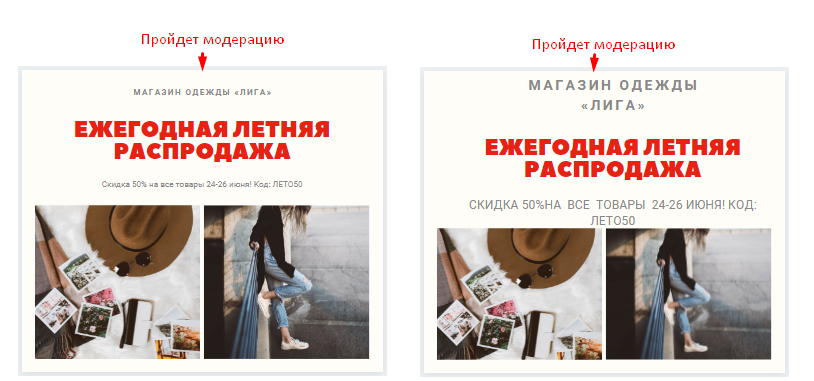 Обратите внимание на пример креативов ниже. Оба пройдут модерацию, но гармоничнее выглядит тот, что слева. Если сделать весь текст капсом, рушится композиция, изображение теряет понятность и привлекательность.