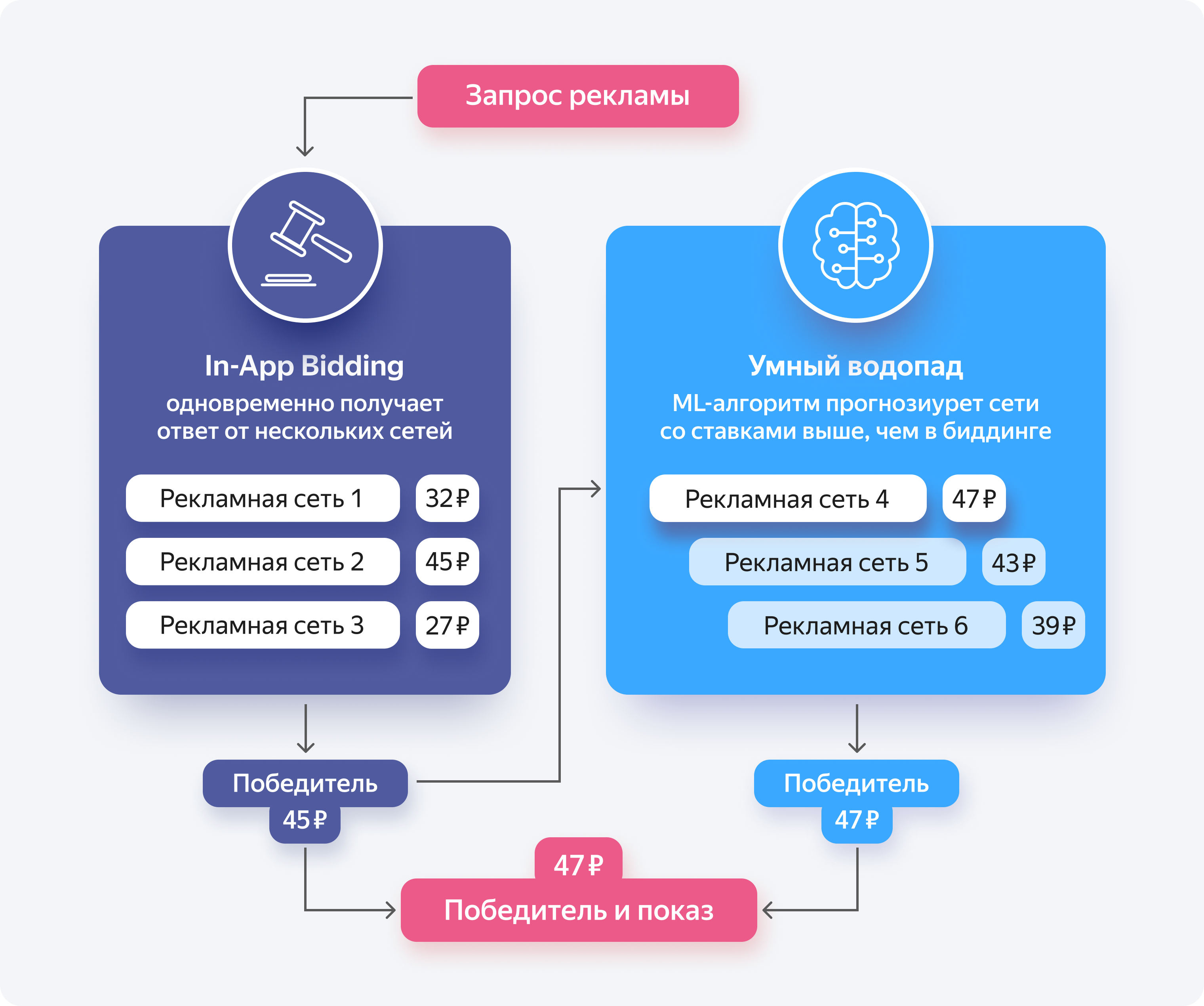 Аукцион проекта VK myTarget работает в Медиации по технологии In-App Bidding. Технология показывает рекламные предложения в реальном времени для каждой рекламной сети. Разработчики планируют добавить по этой технологии и другие сети в дальнейшем. Однако несмотря на упрощение настройки рекламы для издателей, далеко не все сети поддерживают биддинг.