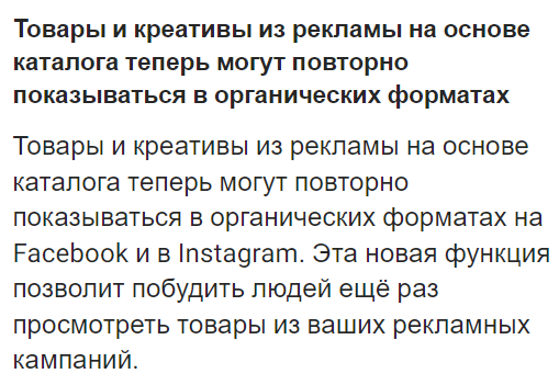 Meta обновила справочный документ для работы с динамической рекламой. В нем сообщается, что информация о товарах из динамической кампании может повторно появится у пользователей Facebook, Instagram и Audience Network, например, в ленте Instagram Shop и других органических форматах.